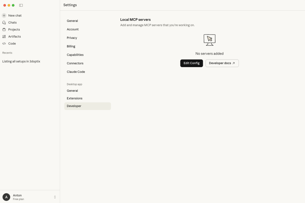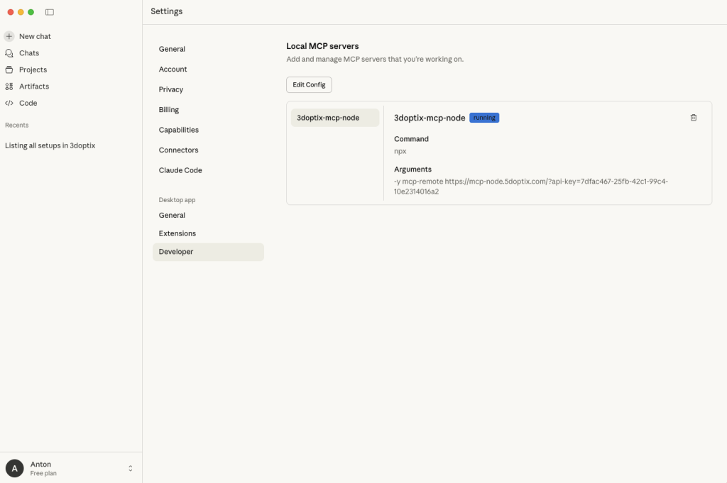 Setup Guide for setting up 3doptix MCP with Claude Desktop