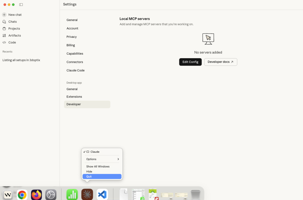 YOUR_API_KEY_HEREwith your real 3doptix API key - Quit and reopen Claude Desktop (Claude Desktop loads MCP