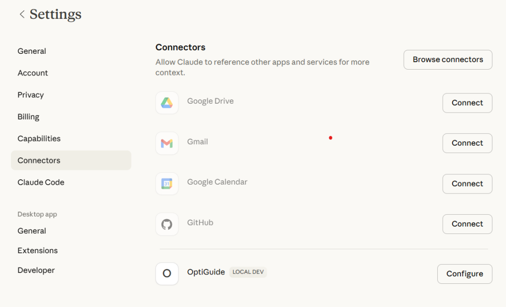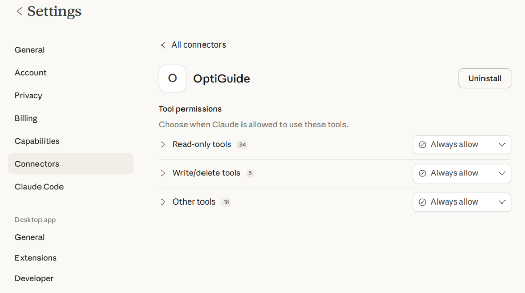 After restart, go to Settings → Connectors, open OptiGuide, and set tool permissions.